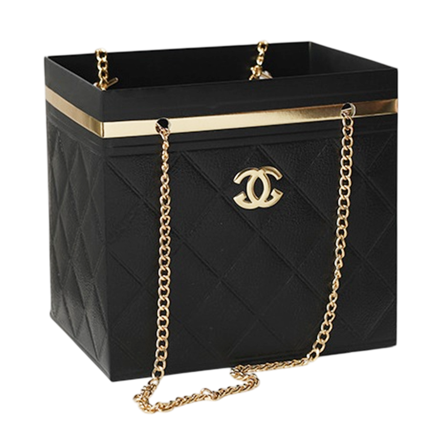 Set 6 buc - Cutie din carton cu aspect de piele naturala matlasata, foldabila, cu toarte din lant metalic de culoare aurie, pentru aranjamente florale/cadouri. Cutia este prevazuta la interior cu un suport de autoblocare a aranjamentului floral.