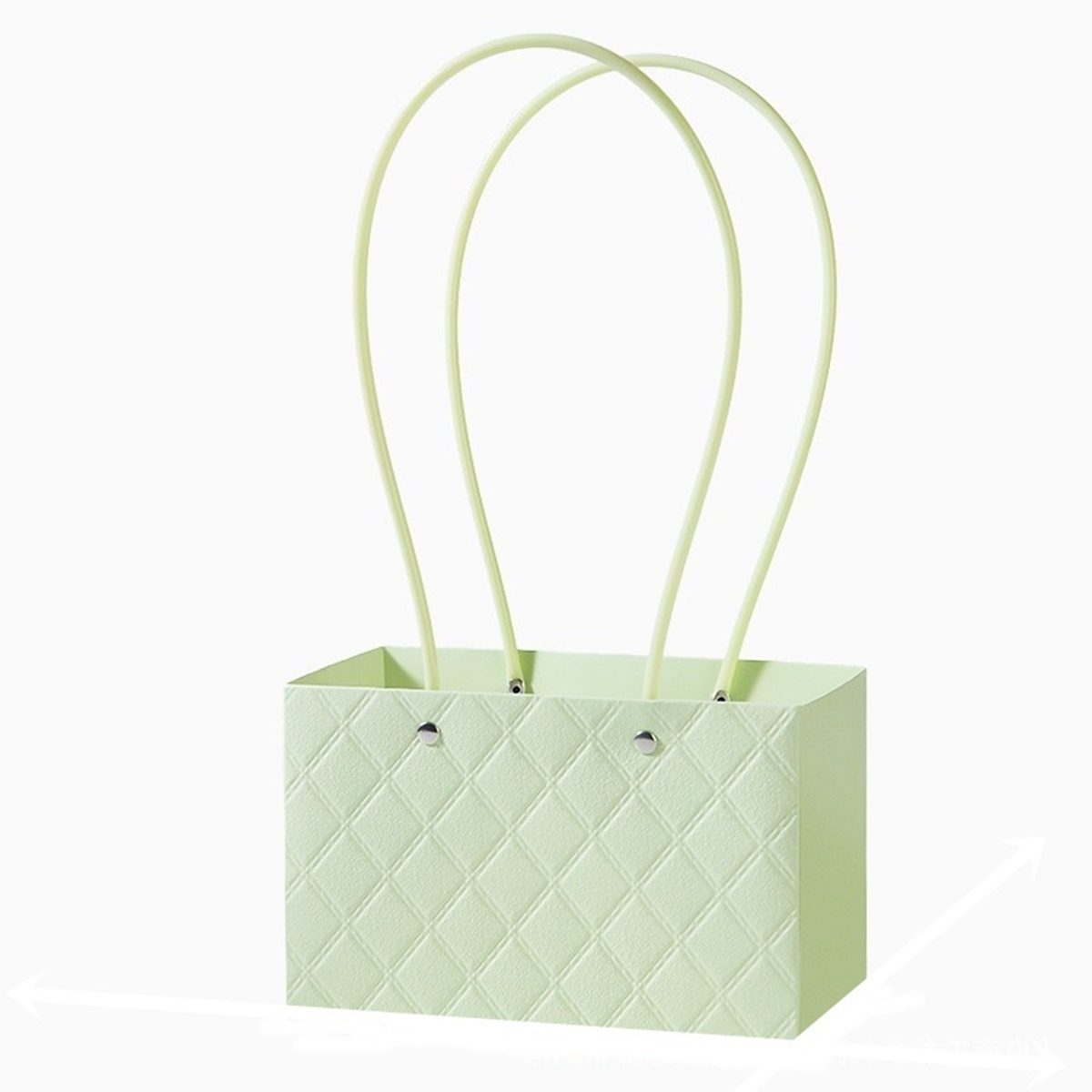 Set 5 cutii din carton, impermeabile, tip Poseta, cu aspect matlasat, pentru aranjamente din flori naturale sau artificiale. Toartele sunt din plastic.