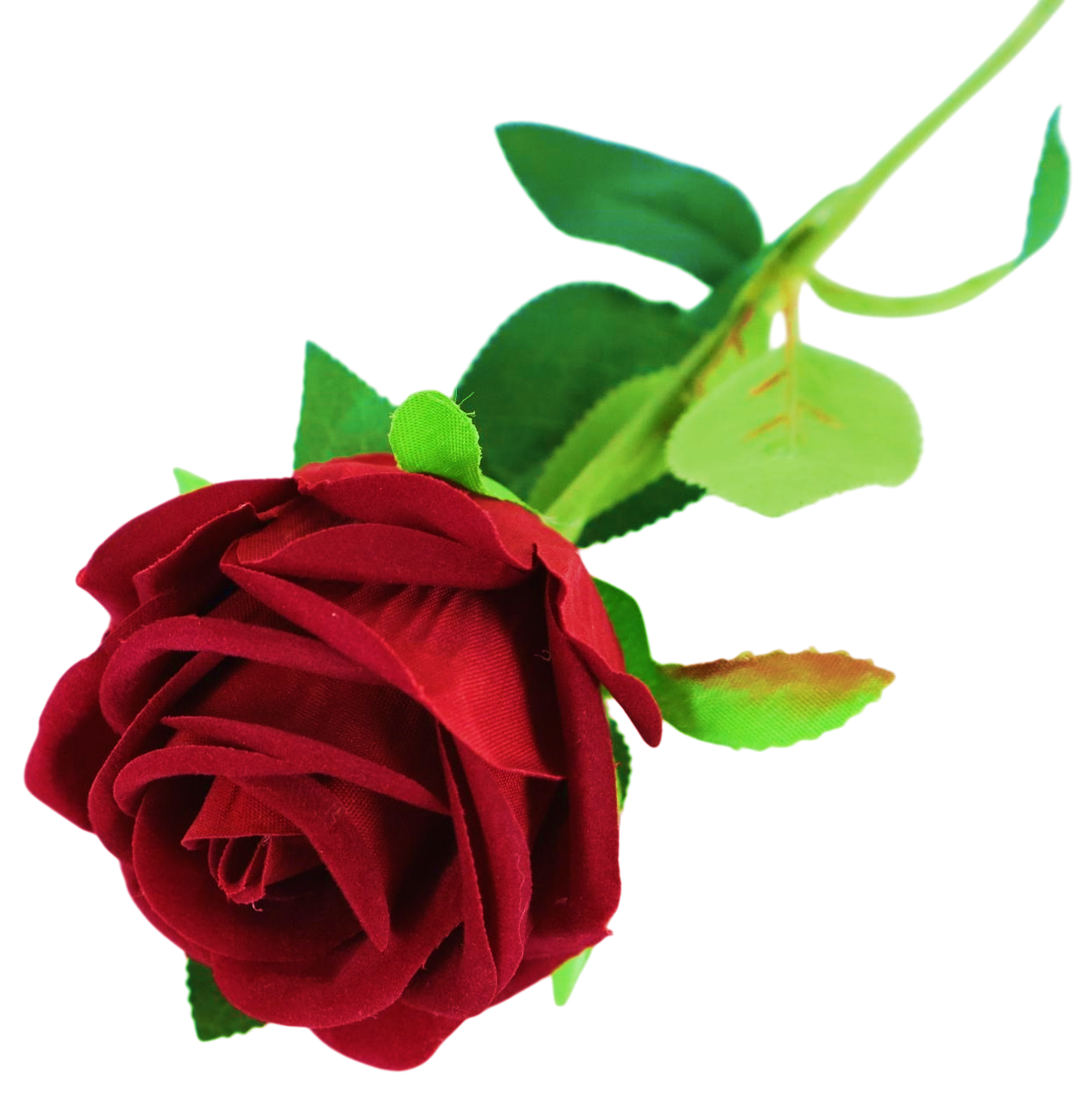 Floare din catifea - Trandafir, pentru aranjamente florale/decoratiuni. Tulpina este din plastic cu insertie metalica, modelabila.