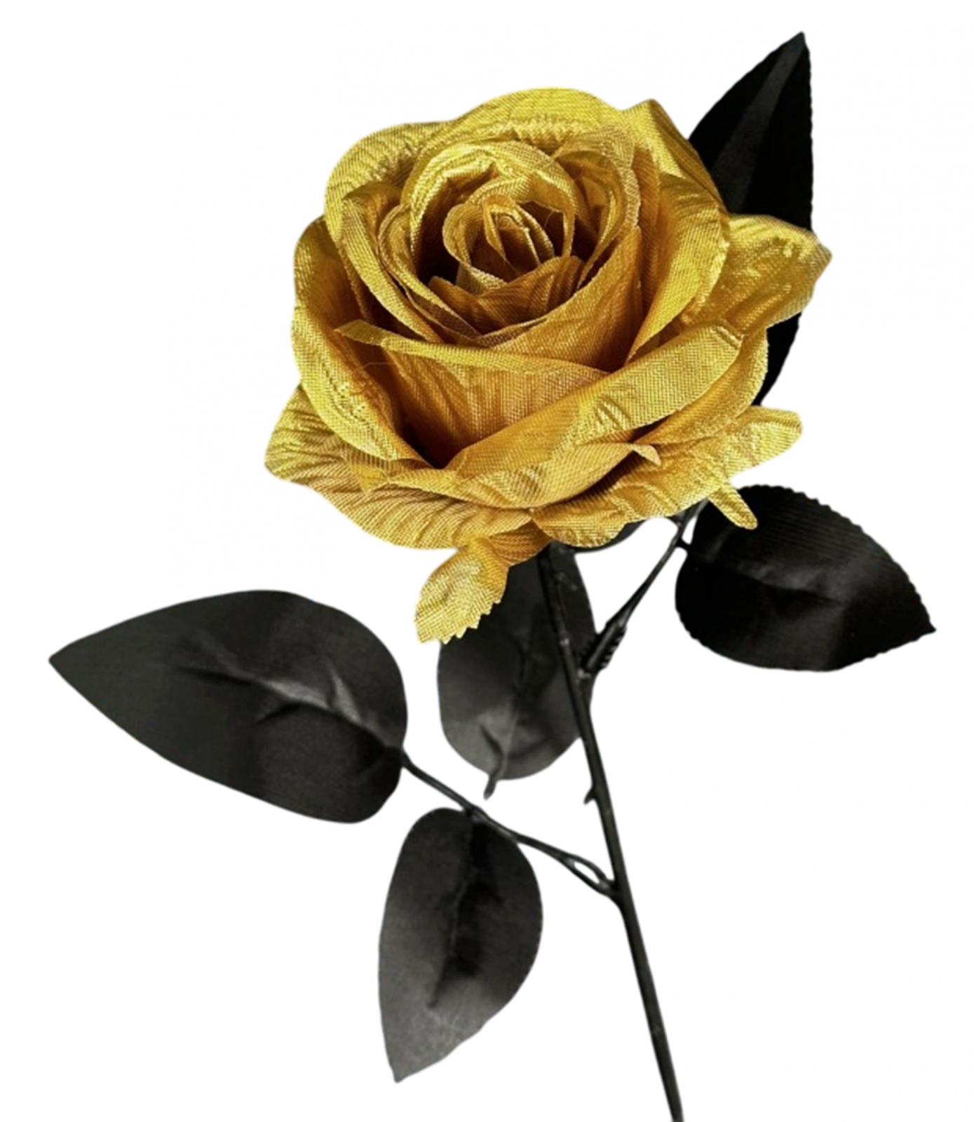 Floare din matase artificiala - Trandafir, pentru aranjamente florale/decoratiuni. Capul de trandafir este de culoare aurie/argintie iar tulpina si frunzele sunt de culoare neagra. Tulpina este din plastic cu insertie metalica, modelabila. Produs de calitate superioara